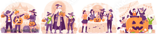 Halloween holiday party vector concept illustration. Man in halloween costume walk pass scary castle at night. Girl count sweets and money after trick or treat game. Web site design template.
