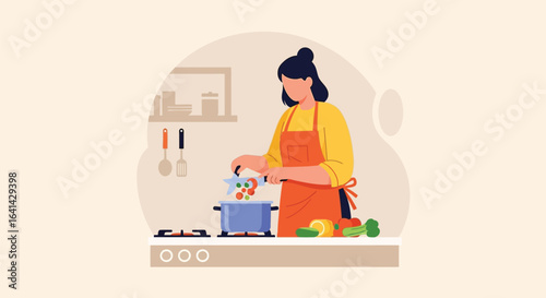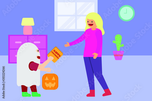 Woman prepare candy for treat or trick traditional autumn festival. Halloween holiday concept illustration. Vector web site design template. Woman carved halloween pumpkin.