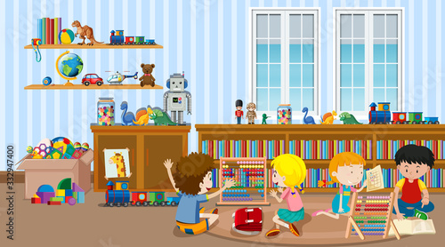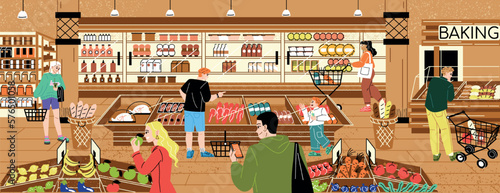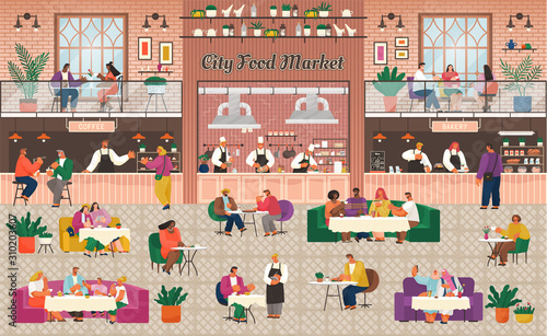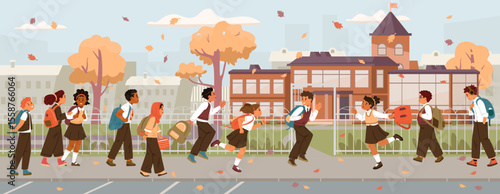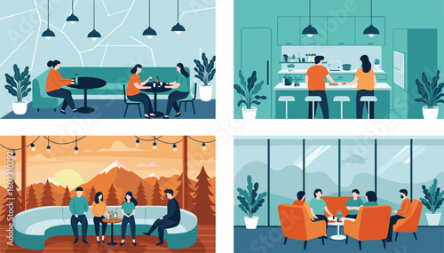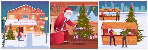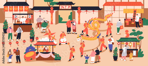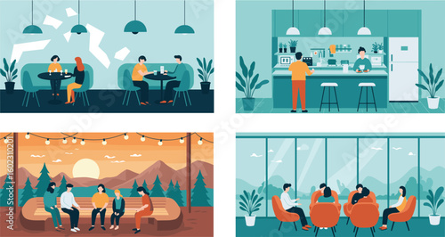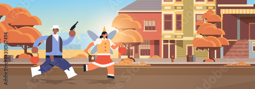 People celebrating Halloween, flat vector illustration. Family characters decorating home with bat garland, pumpkins, friends dancing in carnival costumes at Halloween party, kids trick or treating.