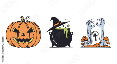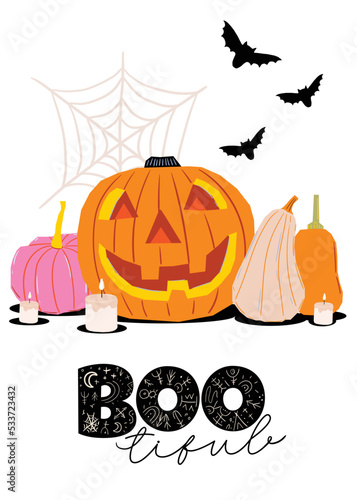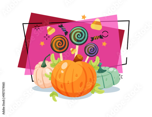 Happy Halloween pumpkin vector. Horror autumn party poster isometric illustration design. Creepy fall season event. 3d jack-o-lantern, bat, candle, eye decoration