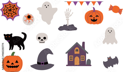 Halloween vector scene. People in spooky costume cheerfully celebrating autumn holiday, having fun at horror october night with scary pumpkin decoration illustration. Trick or treat concept