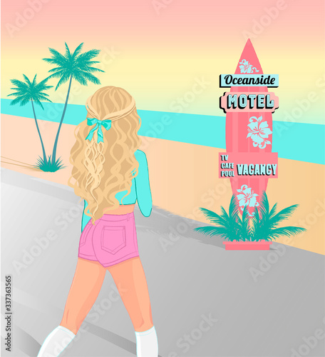 Vector illustration of young woman embroidering flowers with needle and pink thread. Satin stitch hand embroidery for clothing. Atelier, tailoring shop concept design element in flat style.