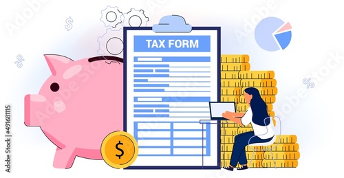 Hand putting coin into piggy bank standing on pile of books, diploma, graduation hat, flat vector illustration. Student loan. Money savings for education.