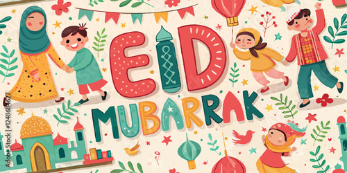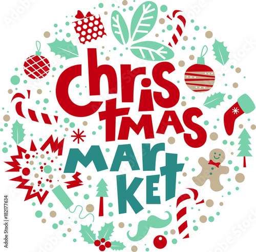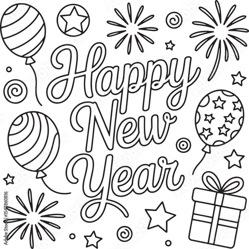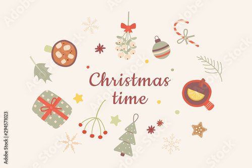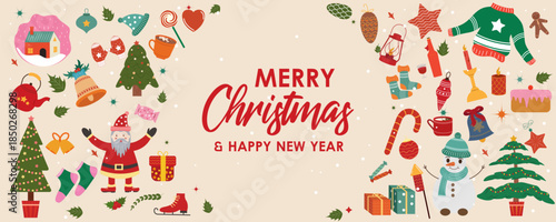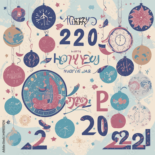 Happy 2024 new year greeting banner in trendy geometric minimal style. Festive fir tree baubles decorative Memphis design elements vector illustration