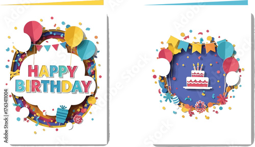 Happy birthday poster template, vector illustration in paper art style. Paper cut birthday cake with candles, balloons, gift boxes and doves.