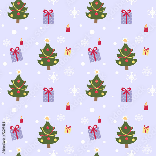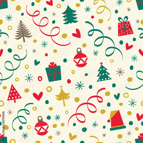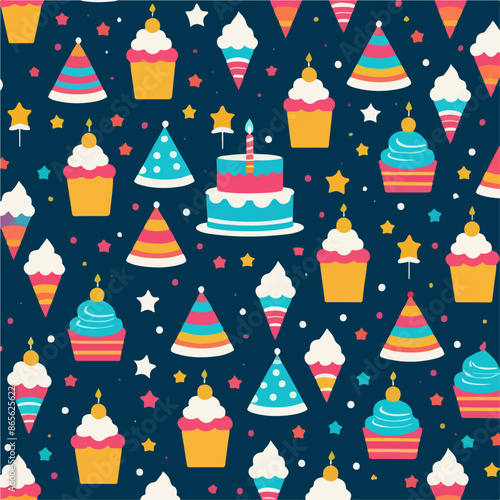 Vector seamless pattern with cute raccoon and panda wearing party hats and gift boxes, candies, cupcakes, party pennants around them. Happy birthday background, wallpaper, fabric, wrapping paper.
