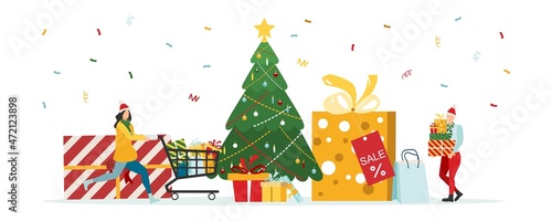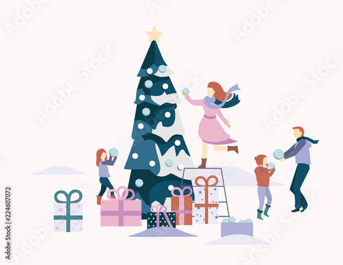 Happy business people celebrating Merry Christmas and Happy New Year, vector flat illustration. New year bash, party with dj, Christmas tree. Male female characters giving gifts, dancing, having fun.