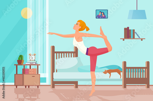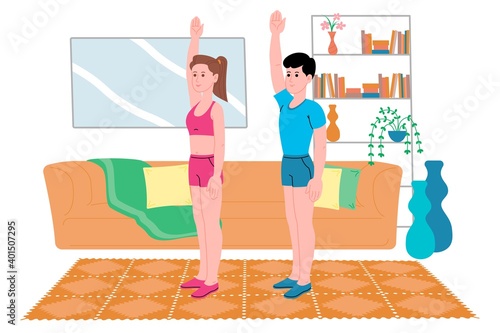 Happy couple celebrating housewarming party together after moving to new home, flat vector illustration. Living room interior with new furniture.
