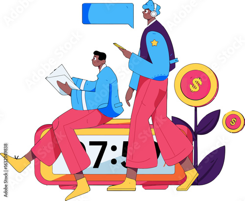 Happy young couple sitting at table in cafe, enjoying coffee drink and talking to each other, flat vector illustration. Colleagues, friends taking coffee break.