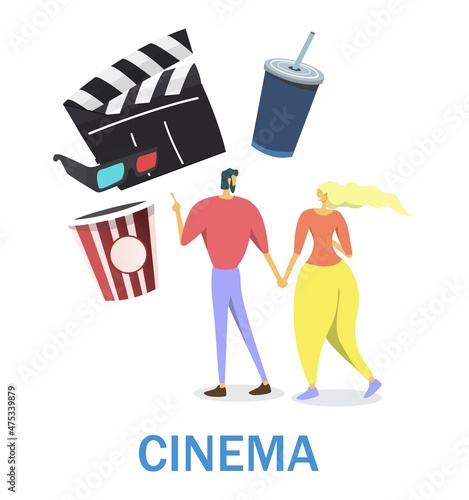 Happy couple going to cinema holding hands, flat vector illustration. Popcorn, clapperboard, soda. Entertainment industry. Romantic date.