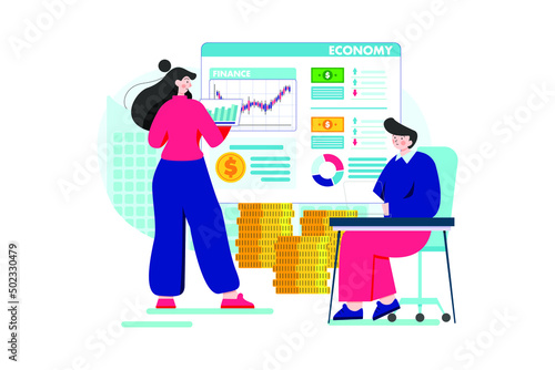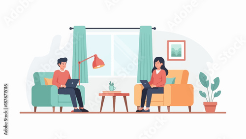 Happy couple hanging the lights on the window in hall room, flat vector illustration. Home decoration, home improvement.