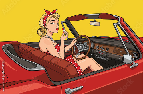 Happy couple in a car driving away. Vector illustration in retro pop art style. Love romance concept.