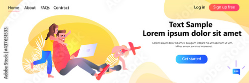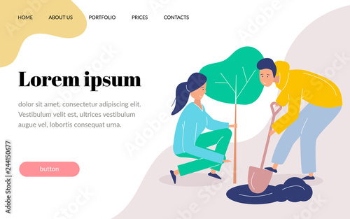 Happy family couple planting tree or flower seedling in soil vector illustration. Volunteering, environment care, green planet or gardening concept