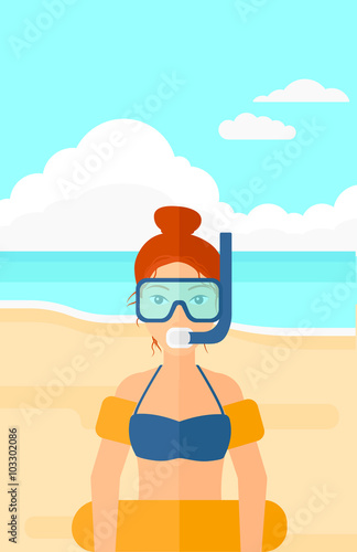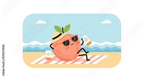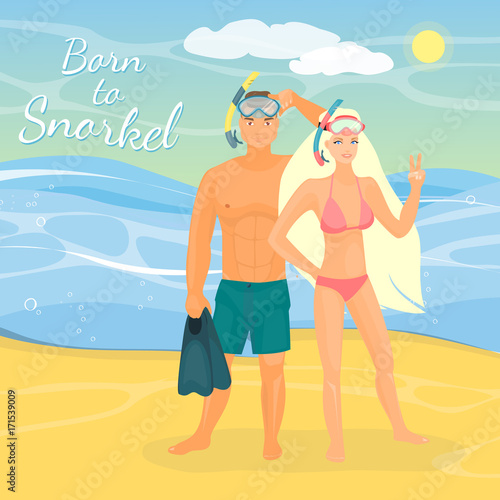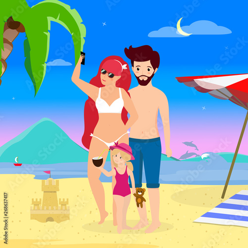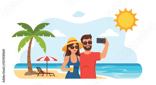 Happy couple taking selfie on beach, flat vector illustration. Summer vacation, beach holidays, romantic trip, traveling.