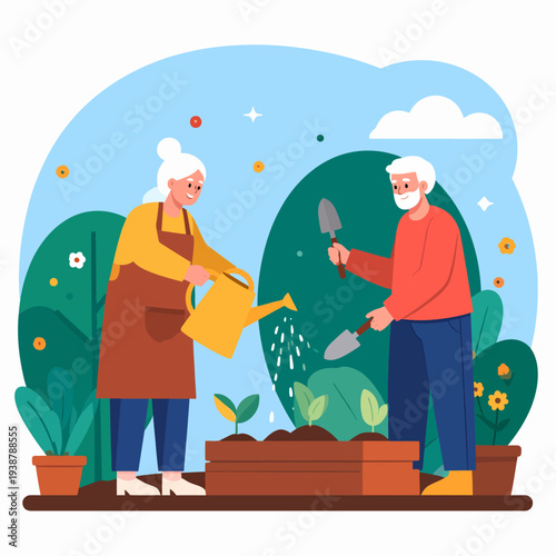 Happy couple walking in forest picking mushrooms, flat vector illustration. Mushroom hunting hobby. Summer and autumn season outdoor activity.