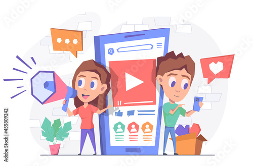 Happy couple with mobile phones and sms, chat bubbles, flat vector illustration. Man and woman chatting online, texting messages. Online communication.