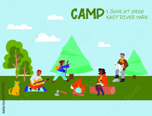 Happy couples having picnic, gathering mushrooms, hiking, sitting at fire in forest, vector flat isolated illustration. People camping, walking holding hands. Forest camp, summer outdoor activity.