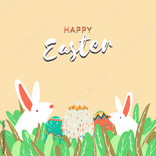 Happy Easter card with easter eggs and easter rabbit. Vector illustration in paper art style.