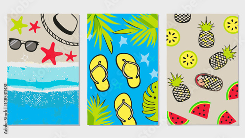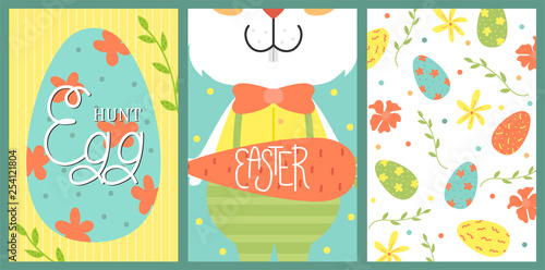 Happy Easter greeting card template with cute design isolated set. Postcard with congratulation text and painted eggs, sweet holiday cake and first spring flower vector illustration