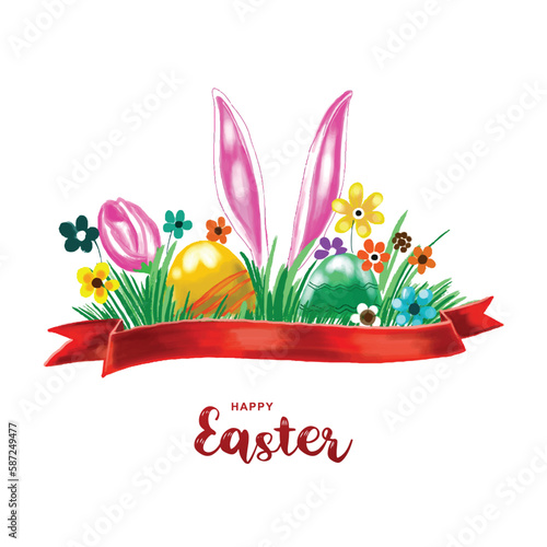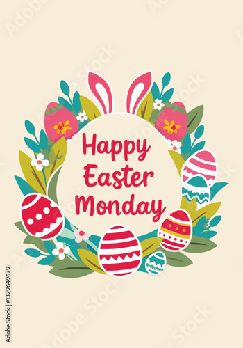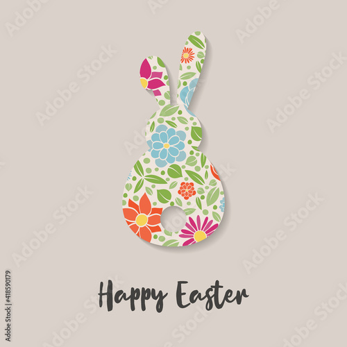 Happy Easter greeting card template. Vector layered paper cut style rabbit in center of floral wreath with Easter eggs.