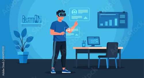 Happy businessman winner holding gold trophy cup above his head, flat vector illustration. Successful employee, the best office worker getting award. Career growth, business achievements, success.