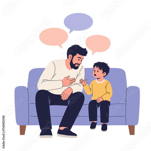 Happy family and parent children conversation vector illustration. Loving father and mother caring supporting calming little toddler daughter feeling stress and unhappy sitting on sofa at home