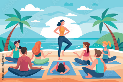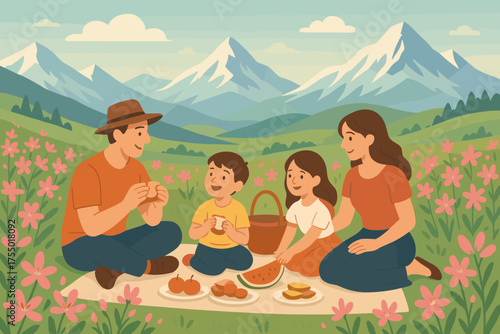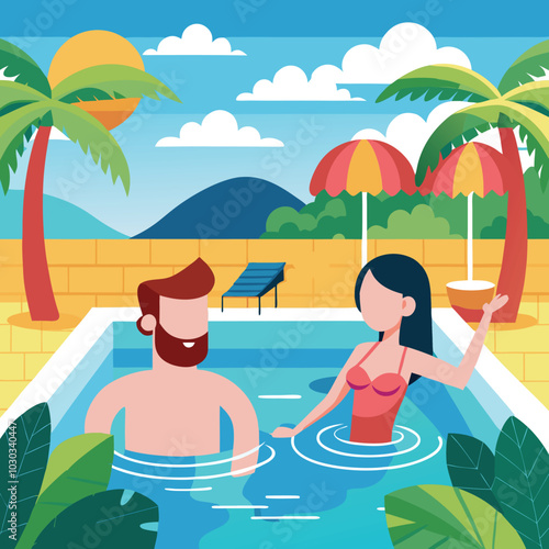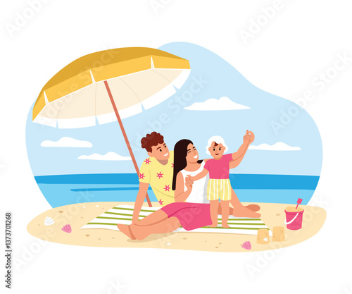 Happy family enjoying summer vacation on beach vector illustration. Man and woman married couple with child rest at seaside of tropical resort cartoon. People activity on holiday