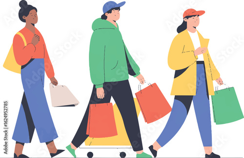 Happy family father, mother and son walking together, vector flat style design illustration isolated on white background. Parenting, motherhood, fatherhood, parenthood, parent-child relationship.