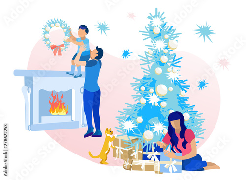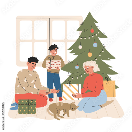 Happy family playing board game sitting on the rug, flat vector illustration. Parents with kids spending time together, playing tabletop game. Home leisure activities and entertainment.