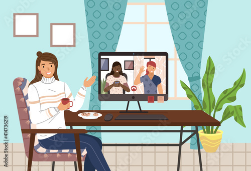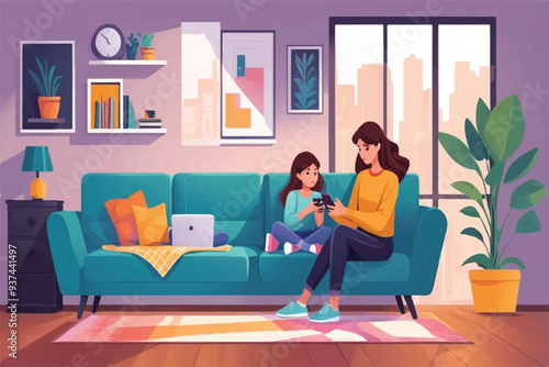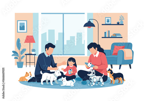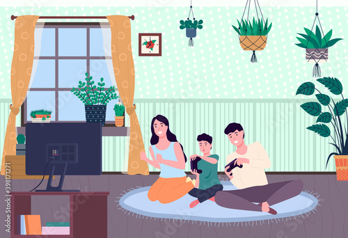 Happy family playing board game together sitting on the floor in living room, flat vector illustration. Parents with kids enjoying free time with playing tabletop game at home. Family relationship.
