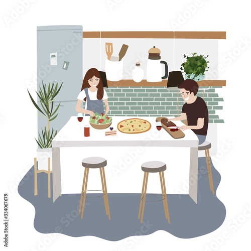 Happy family stay at home concept vector illustration in cartoon style. Mother and daughter watering plant in home garden. Father plays with son while mother uses laptop sitting on sofa.