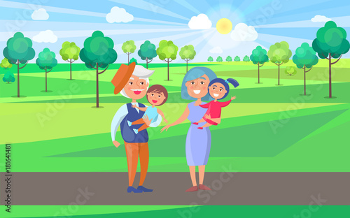 Happy family vector illustration. Father, mother and son walking in the park flat style design element.