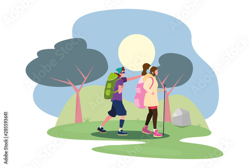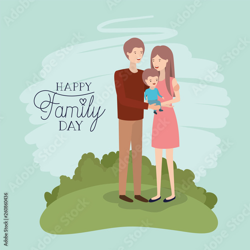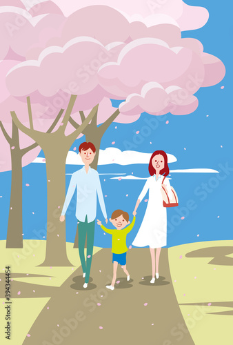 Happy family walking in a park with kid. Vector illustration in paper art origami style. Happy mother and father day poster. Paper cut craft design