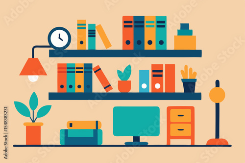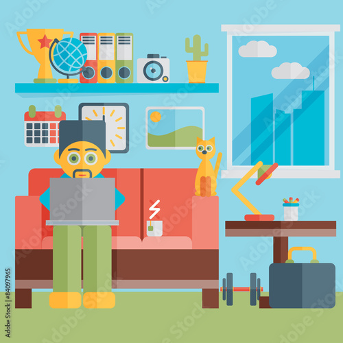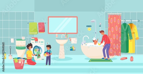 Vector illustration of happy family father, mother with two sons watching tv. Living room interior. Flat style design.