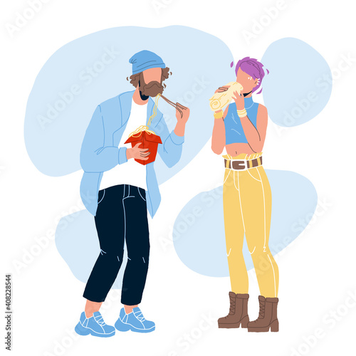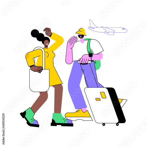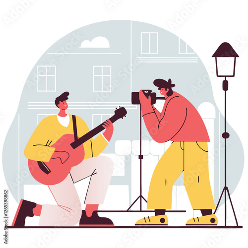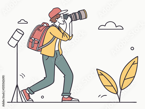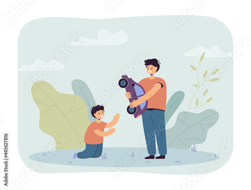 Happy father and son going hiking together, flat vector illustration. Family characters trekking, traveling with backpacks. Parent child relationship, happy fatherhood and parenting. Outdoor activity.
