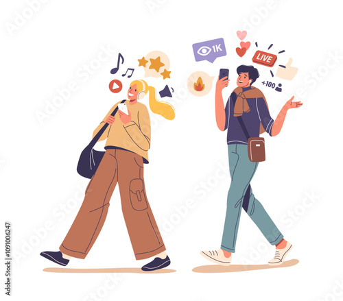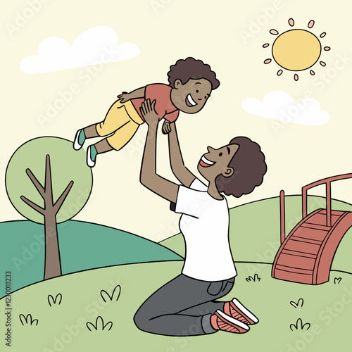 Happy father and son going hiking together, flat vector illustration. Family characters trekking, traveling with backpacks. Parent child relationship, happy fatherhood and parenting. Outdoor activity.