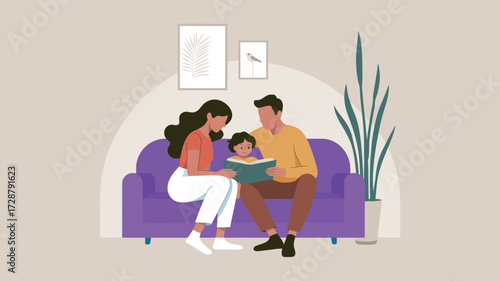 Happy father reading book to son sitting in armchair in living room, flat vector illustration. Dad and kid spending time together. Parent child relationship, happy fatherhood and parenting.