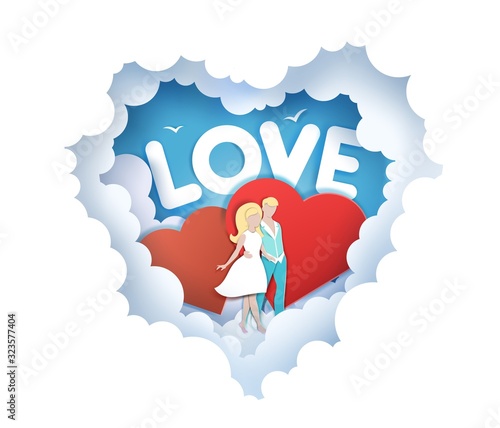 Layered paper cut style heart with happy father with two kids walking along fluffy clouds and holding umbrella, vector illustration in paper art craft style. Happy Fathers Day greeting card template.