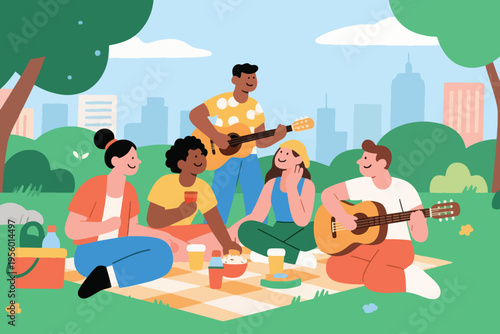 Happy friends enjoying bbq picnic party on terrace vector illustration. Young man and woman grilling barbecue meat, eating salad and drinking beer, talking and sharing positive emotion
