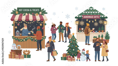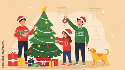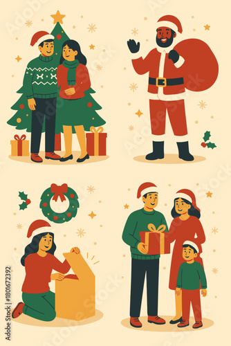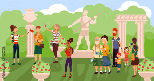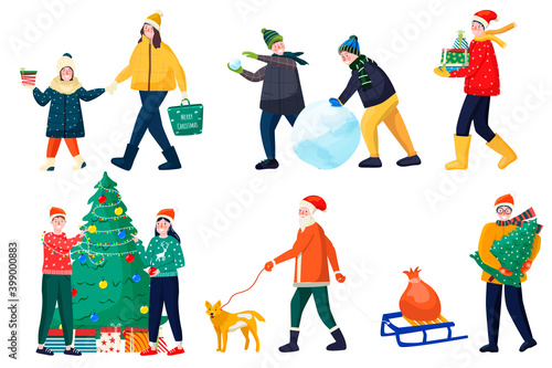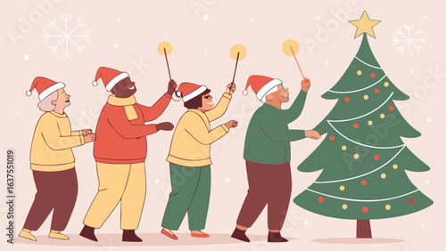 Happy friends standing behind Christmas tree on city street posing for group photo. New Year celebration outdoors vector illustration