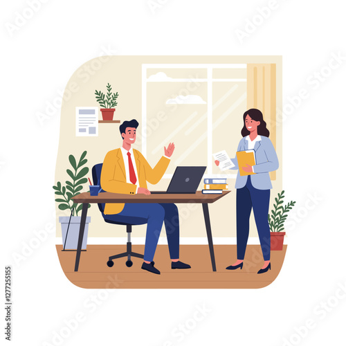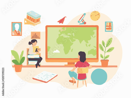 Happy girl, freelance artist, graphic designer, illustrator working on laptop computer from home office, flat vector illustration. Freelance, creative remote work, home workplace.