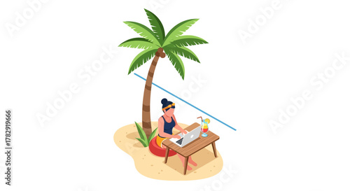 Happy girl, freelancer working on laptop computer sitting on chaise longue on beach, flat vector illustration. Freelance, relax, outdoor remote work, summer vacation.