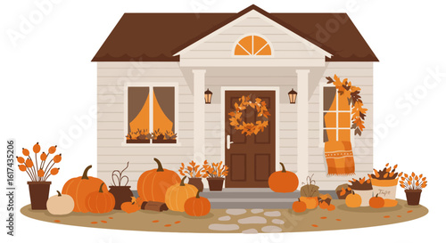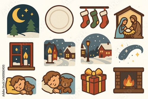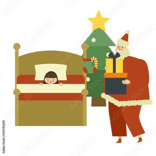 Happy girl putting gift box in Christmas sock, flat vector illustration. Decorated fireplace with Christmas wreath, socks, garland and gifts. Preparation for Xmas, New Year winter holidays celebration