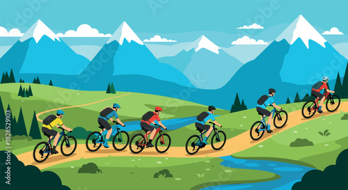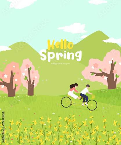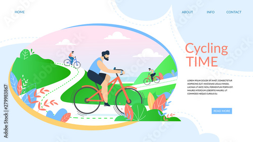 Happy girl riding bicycle on rural road. Outdoor nature landscape. Countryside farm. Woman cycling. Vector web site design template. Landing page website concept illustration