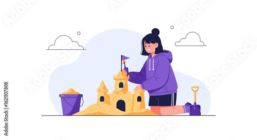 Happy smiling girl shopping for clothes, shoes on the internet using laptop computer, flat vector illustration. Online store, e-commerce, online ordering and delivery.