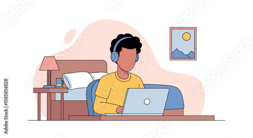 Happy smiling girl shopping for clothes, shoes on the internet using laptop computer, flat vector illustration. Online store, e-commerce, online ordering and delivery.