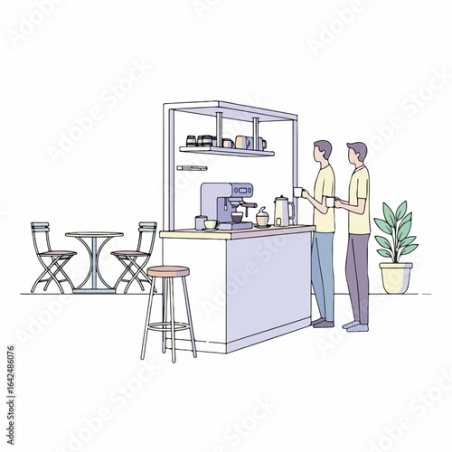 Happy girl sitting at table, eating, drinking coffee and using mobile phone, flat vector illustration. Kitchen interior. Young people lifestyles. Social media and smart phone addiction.