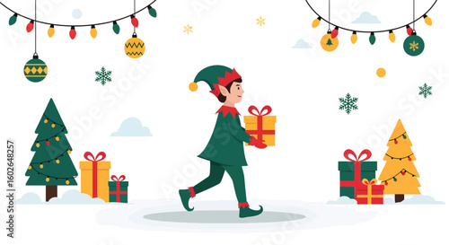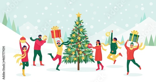 Happy girls celebrating Christmas online, flat vector illustration. Laptop computer and smartphone screens with young women in Santa hats. Online party, video call technologies.
