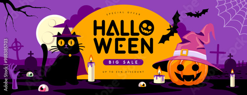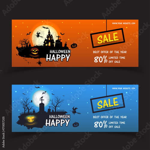 Halloween banner template set, vector illustration in paper art style. Happy Halloween party invitation, sale backgrounds with scary pumpkings, haunted house, bats, cemetery, spiders, dead tree cobweb