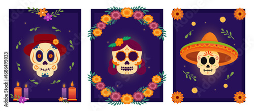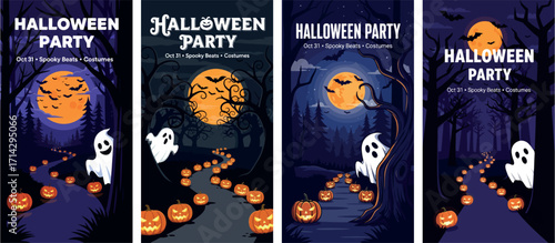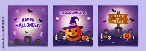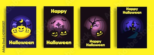 Happy Halloween party invitation greeting card set, vector illustration in paper art style. Paper cut traditional Halloween symbols scary pumpkin, haunted house, flying bats, cemetery, dead tree.